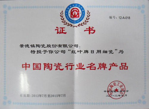 經過嚴格的評定,中國陶瓷工業(yè)協(xié)會近期公布了最新的“2012中國陶瓷行業(yè)名牌產品”榮譽榜單。經過數(shù)輪的激烈角逐評選,公司 “紅葉”牌日用陶瓷名列榜單。